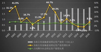 在歷經(jīng)10年的投資高速增長(zhǎng)后,市政公用設(shè)施建設(shè)大體完成,2012年之后投資開(kāi)始進(jìn)入穩(wěn)定增長(zhǎng)通道,近幾年的投資額基本穩(wěn)定在2萬(wàn)億左右,占同期全社會(huì)固定資產(chǎn)投資總額的比例持續(xù)下降。2016年全國(guó)市政公用設(shè)施建設(shè)固定資產(chǎn)投資總額為2.1萬(wàn)億元,占同期全社會(huì)固定資產(chǎn)投資總額的3.4%。